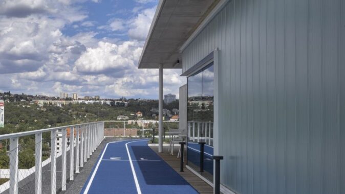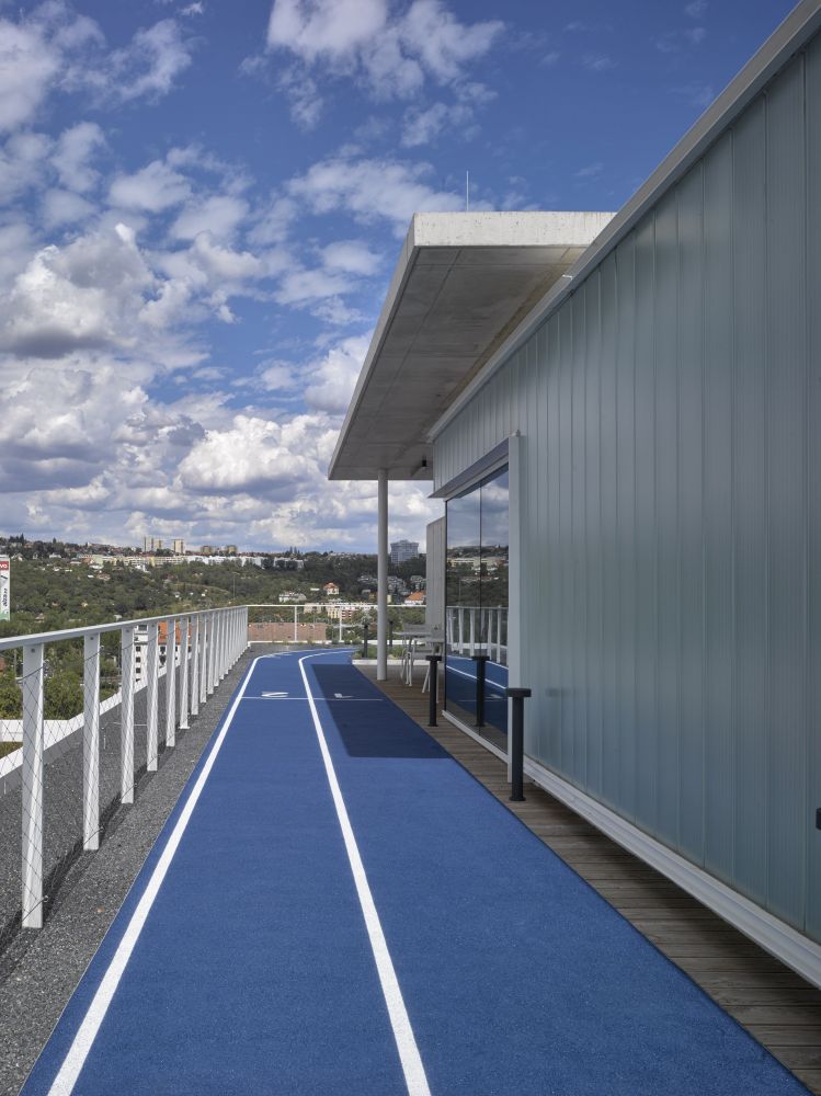 Střechy jsou řešeny jako relaxační zóny, na střeše západní věže je po obvodu umístěna běžecká dráha.