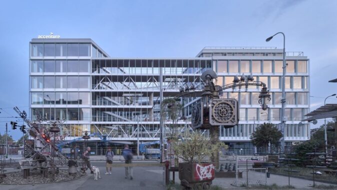 Administrativní objekt má jednoduchý kubický objem s akcentovaným nárožím. Díky půdorysnému konceptu ve tvaru písmene H si budova v parteru vytváří pobytovou krajinu s přesahem do širšího veřejného prostoru. Venkovní pobytové prostory jsme přenesli z parteru i do interiérů. V každém patře jsou k dispozici terasy s jednotným konceptem zeleně vysazené v bílých květnících. Tento koncept graduje směrem do Plynární ulice, kde je fasáda perforována sestavou exteriérových lávek propojující obě části budovy. Vzniká tak vertikální krajina odrážející život uvnitř budovy.