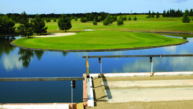 většina domů situována v linii přímo podél hráze golfového jezera a promyšleně