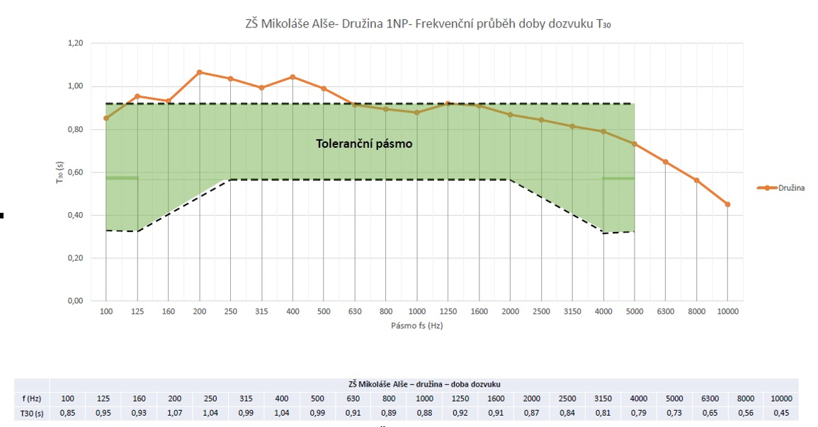 V neposlední řadě se série měření vztahovala na akustické podmínky a míru hluku ve třídách. Během měření byla jak ve Slavkově, tak v Suchdole zaznamenána vysoká míra odrazivosti, překračující optimální dobu dozvuku stanovenou na 0,7 s. „Právě hluk a špatně řešená akustika představuje jeden z velkých problémů vnitřního prostředí ve školách. Důsledkem je často únava a ztráta koncentrace, což může vést i ke zhoršenému prospěchu dětí. Tento hluk neprospívá ani jejich pedagogům, kteří se nejrůznější zvukové šumy snaží překřičet, a vzniká tak začarovaný kruh způsobený vysokou odrazivostí hladkých ploch v místnosti,“ uvádí Jiří Gina z firmy Armstrong, jež je předním světovým výrobcem stropních systémů včetně akustických podhledů a která prováděla akustická měření tříd ve Slavkově. „V ZŠ Mikoláše Alše v Praze jsme sledovali dvě rozdílné místnosti z hlediska vybavení, a to učebnu fyziky a školní družinu. Měření také prokázalo, že velký vliv má vybavení tříd – zatímco v učebně fyziky byly zaznamenány vysoké hodnoty odrazivosti, tak družina, ve které byl umístěn koberec a nábytek s knihami, měla znatelně lepší odrazivost v maximální hodnotě 1,1 s. Je však nutné podotknout, že tento relativně dobrý výsledek není dán dispozicí samotné místnosti. Pokud by došlo k vystěhování části nábytku, lze předpokládat, že by se doba dozvuku výrazně zvýšila“, vysvětluje Jiří Strnad ze společnosti Saint-Gobain Ecophon, která vyrábí a dodává akustické výrobky a systémy.