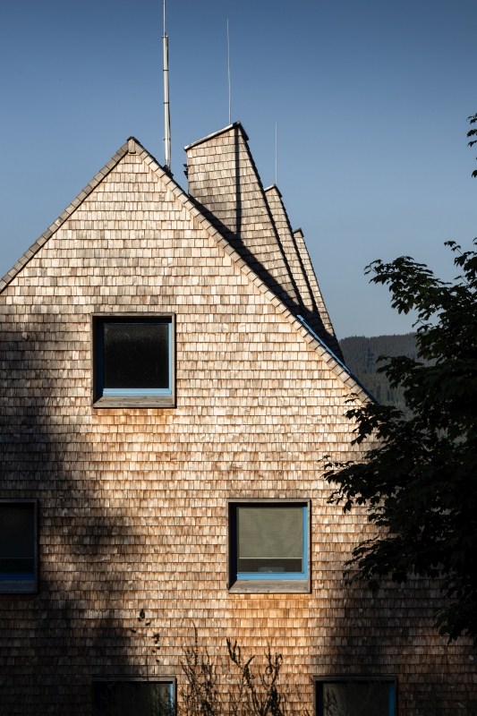 Stavba je pojata v tradičních materiálech – dřevěné obložení tvoří modřínový šindel pocházející z místních lesů, který je volnou parafrází fasád místních stodol, ale i štítů obytných staveb. Do kontrastu s přirozeně šednoucím obkladem jsou posazeny barevné lodžie, které stavbám dodávají barevný akcent a živost.
