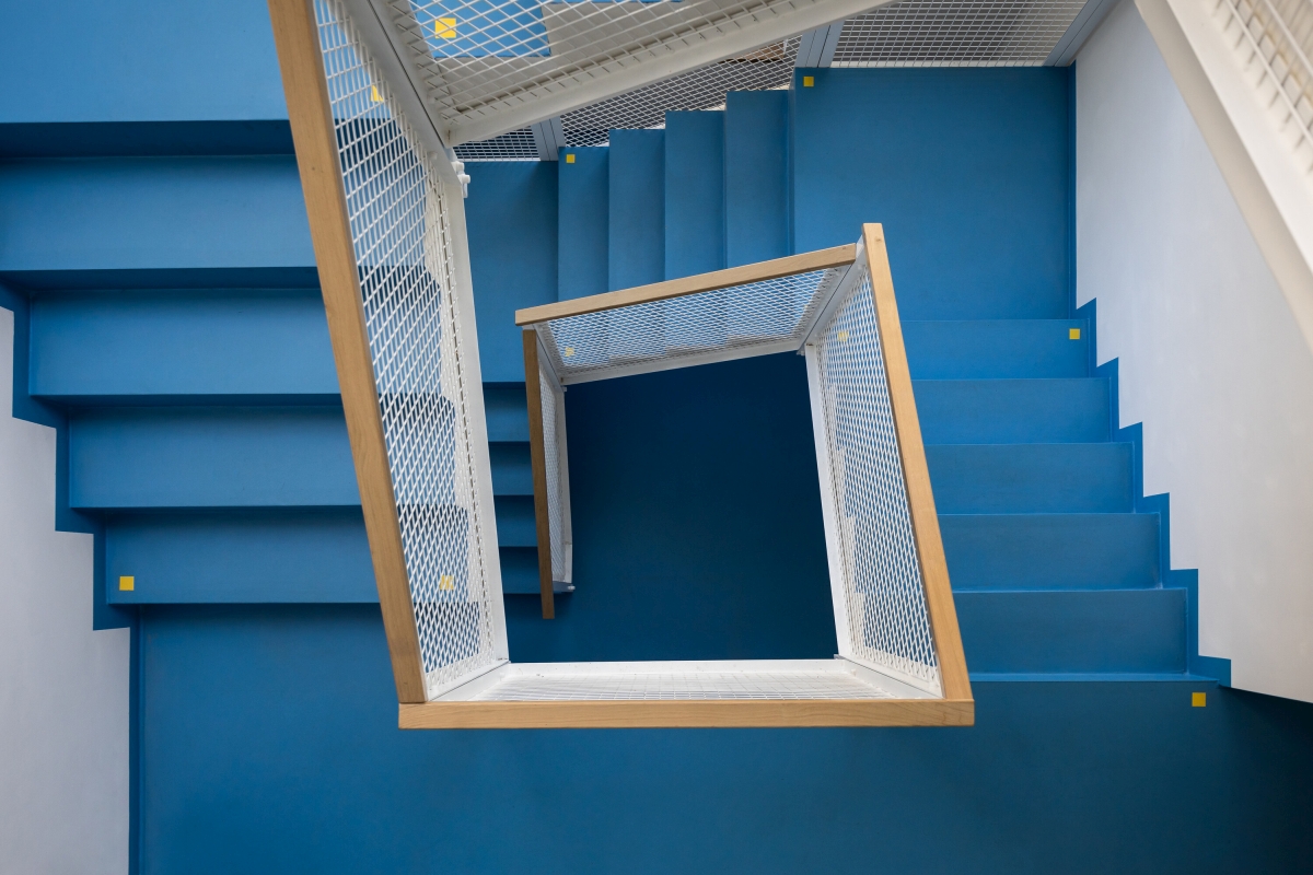 V kontrastu k „měkkému“, postupem času tmavnoucímu nehoblovanému modřínovému obkladu hlavní hmoty domů odebíráme prostory lodžií. Ty pak krystalicky září barevnou skleněnou mozaikou a spolu s přísně čtvercovými okny stejné barvy rámů definují charakter objektů.