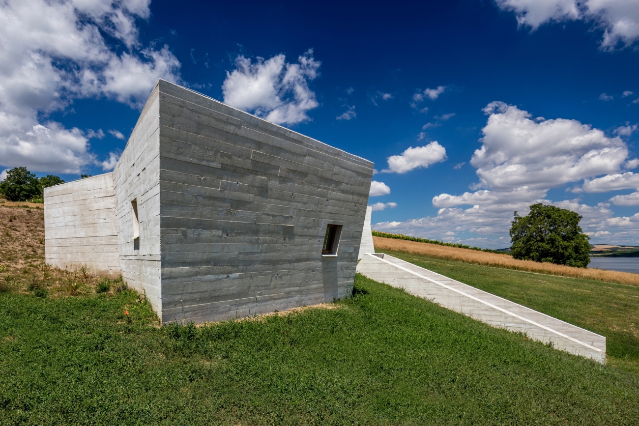 Spodní stavba byla provedena z vodostavebního betonu C 25/30 XC2; 90D s těsnicí krystalizační přísadou s protiradonovou funkcí. Stěny jsou oboustranně bedněné s interiérovou plochou z pohledového betonu s otiskem nehoblovaných prken. Zachování struktury nehoblovaných prken otisknutých do betonu vyžaduje zvýšené nároky na návrh receptury, dodržování technologických postupů při výrobě betonu i při samotné ukládce. U hlavního vstupu jsou monolitické stěny z bílého betonu C 30/37 XF3, které vytvářejí zářez do upraveného terénu. Pohledová část je opět zhotovena obtiskem nehoblovaných prken. Vstupní monolitické stěny přecházejí do prefabrikovaných dílců z bílého betonu, které v sobě mají otvory připomínající kly mamutů.