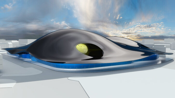 Zamýšlená českobudějovická stavba dostala díky tvaru a barvě přezdívku Rejnok. Dokončená studie je Kaplického nejdopracovanějším dílem v tuzemsku. Navržený objekt má trojúhelníkový půdorys a zaujímá plochu téměř 1,5 hektaru. Centrum má mít dva koncertní sály pro 1000 a 400 posluchačů.