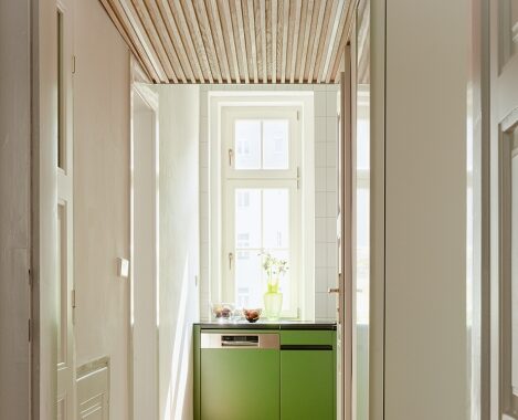 Na halu navazuje snížený průchod do kuchyně, s výrazným podhledem, nad kterým je skrytý úložný prostor. Podhled je tvořen vloženými dubovými lamelami, které jsou zároveň podsvětleny a nahrazují v tomto místě stropní světlo. Prvek lamel se opakuje v celém bytě. Praktická jednoduchá kuchyň ve tvaru L byla provedena v plné zelené barvě, která ji povyšuje na jeden z výrazných prvků bytu.