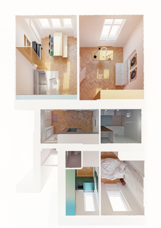 Rekonstrukce pozvedla původní byt na novou úroveň. Vytváří čistý a klidný osobní prostor pro kultivované majitele i jejich umělecká díla.