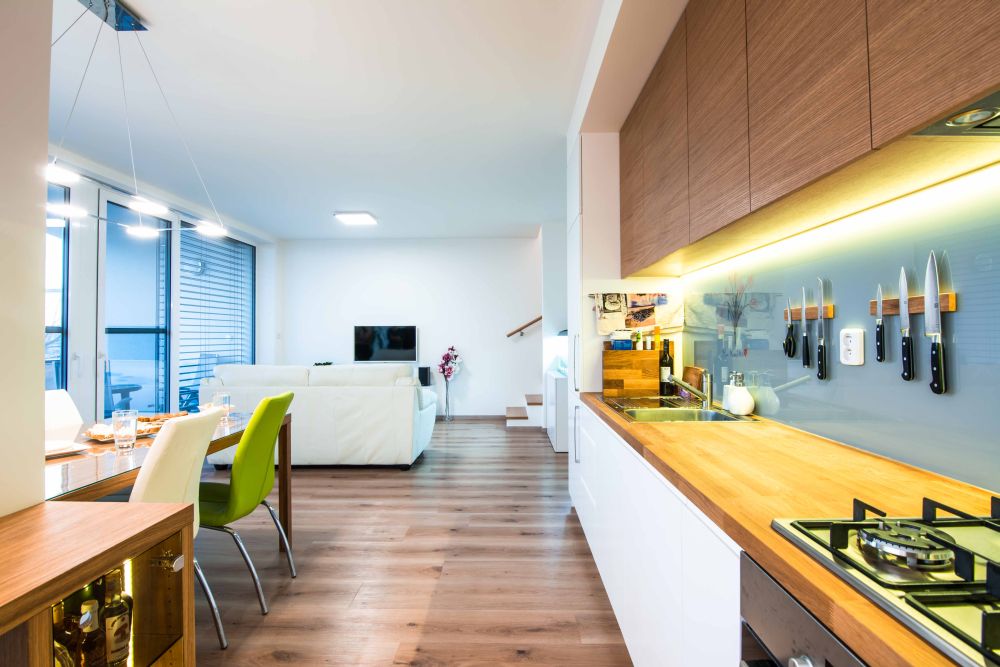 Jednoduchá barevnost staví na kombinaci bílé a dubové dýhy. Motivem bytu je v první řadě ohromující výhled celou podélnou stěnou obývacího pokoje s jídelnou a pak také ložnice. Majitelé tento základní prostor oživili židlemi a doplňky. Dobře funguje i protilinka „levitující“ před oknem. Oproti našemu záměru – zachovat kontinuitu protilinky a jídelního stolu nakonec sešlo. Nicméně i stávající řešení s volným stolem funguje dobře. Stůl má víc v prostoru.