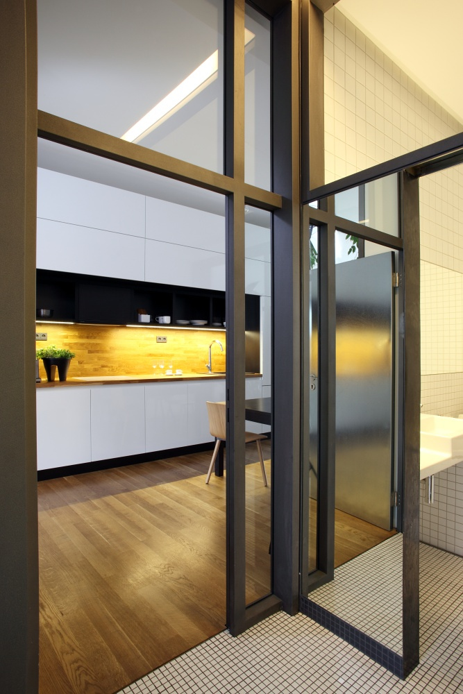 do původního otvoru železobetonového skeletu domu. Denní světlo se tak dostává