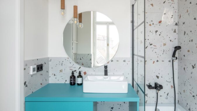 Aby takto maličký prostor nepůsobil ponuře, rozhodli jsme jako ústřední barvu použít sytě modrou a doplnit ji o příjemnou texturu dřeva na nábytku i podlaze a béžové tóny na stěnách. Hravost interiéru jsme chtěli dostat i do koupelny, a tak jsme zvolili terazzo obklad s barevnými segmenty a nechali zde odkrýt cihlovou klenbu. Vše je doladěno černými doplňky industriálního ražení a svítidly pro vytvoření vícero příjemných večerních nálad.