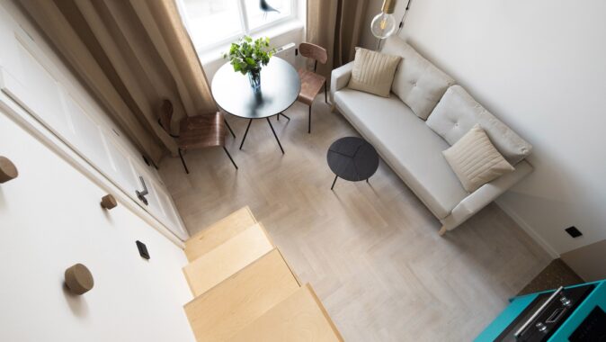 Díky staré zástavbě s vysokými stropy jsme mohli v návrhu využít možnost spaní v patře. Pro nedostatek místa se do patra dostanete po schodech, které kromě knihovničky zároveň skrývají chladničku a spíž. Maličkatá kuchyňka v sobě má všechny moderní spotřebiče: Lednici s mrazákem, varnou desku, troubu, mikrovlnku, odsavač par a dokonce i myčku. Odpočinout si můžete na menší pohovce a večeři servírovat na kulatém stolu pod velkým špaletovým oknem. Šatní skříně jsou umístěny z druhé strany kuchyně tak, aby odclonily přímý pohled od vstupu do obytné části bytu. Zároveň vytvářejí chodbičku k toaletě tak, aby byla co nejdále od zbytku bytu.