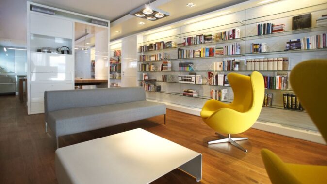 knihovny, pro maximální pocit odlehčení jsou její záda ze skleněného čirého