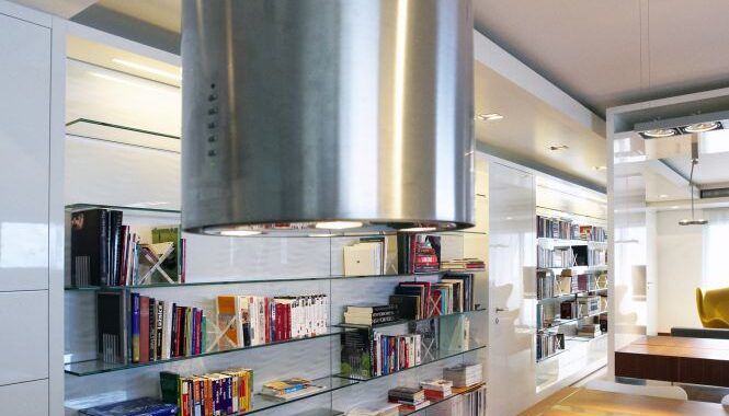 vykonzolovány skleněné police. Celkový dojem lehkosti umocňuje horní nasvícení,