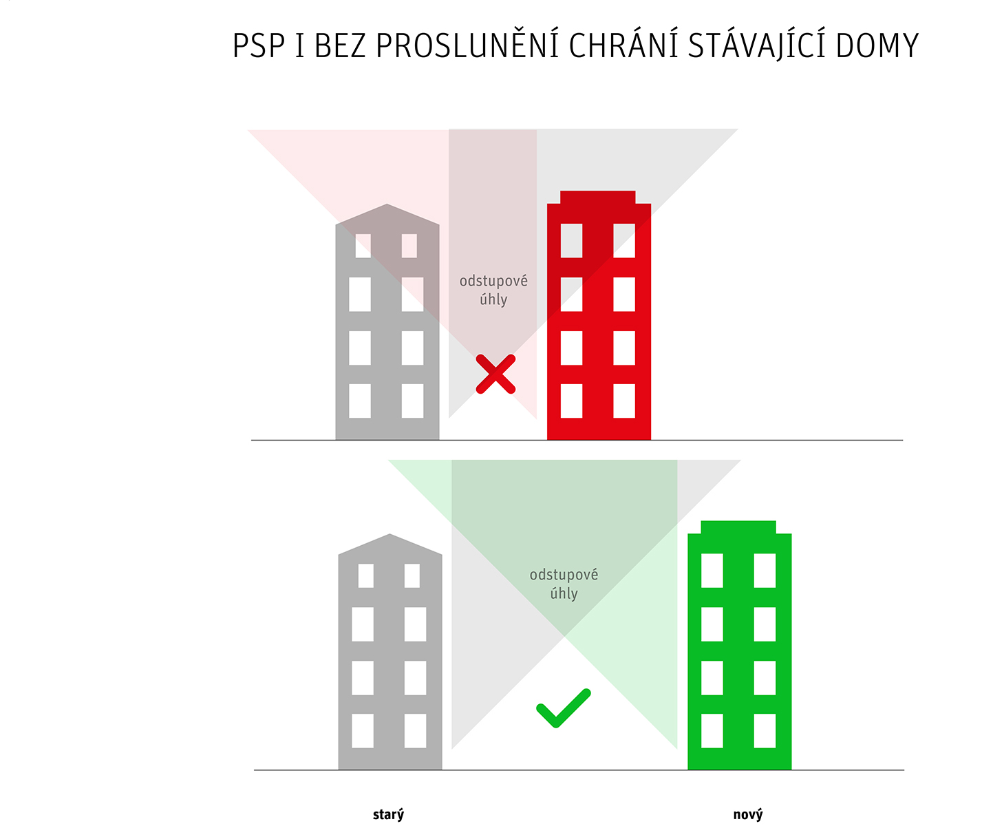 „Požadavek na oslunění bránil často rozumné míře a intenzitě zástavby městského charakteru; oslunění nelze zaměňovat za osvětlení, což je standard, který brání tvorbě nějakých ‚tmavých špeluněk‘. Vyškrtnutí požadavku na oslunění umožní vznik kvalitních městských struktur a městského veřejného prostranství,“ řekl právník Jiří Plos. A dodal: „Podíváme-li se na nejcennější části města, zejména historická města pražská, nebyla by jejich výstavba za dosud platných požadavků možná – přesto jsou hodnocena z hlediska kvality života v nich jako nejpřitažlivější.“