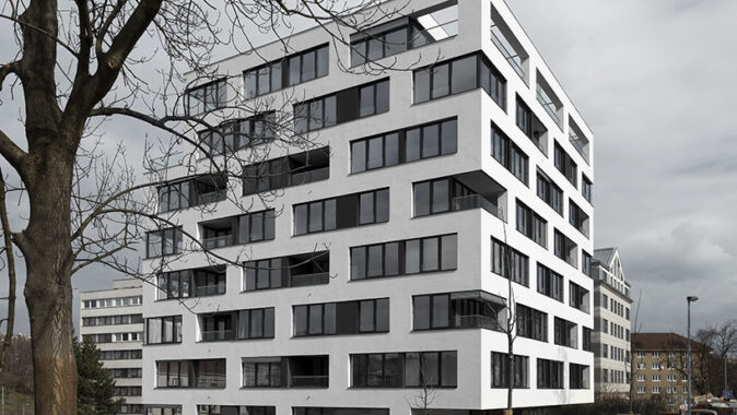 Dům působí elegantně a fasáda si i přes svou jednoduchost nápaditě hraje s okenními a balkonovými výřezy, které tu obíhají roh a tu u něj těsně končí, poslední patra ustupují, aby poskytla obyvatelům prostorné terasy s výhledem na slibované pražské panorama. V komplikované okolní situaci tak architekti vykouzlili příjemnou, jednoduchou, a přece hravou stavbu s jasným kubickým výrazem a zajímavou strukturou. Nicméně jak jsem již naznačila, síla architektury domu spočívá právě v jeho osamělosti. Kdyby byl zapadal do rozsáhlejšího projektu bytové výstavby, i přes svou kultivovanost by nevyhnutelně vytvořil dojem sídliště, jak seto stává mnoha zajímavým bytovým domům ve větších komplexech.