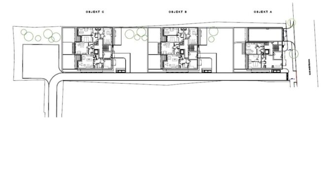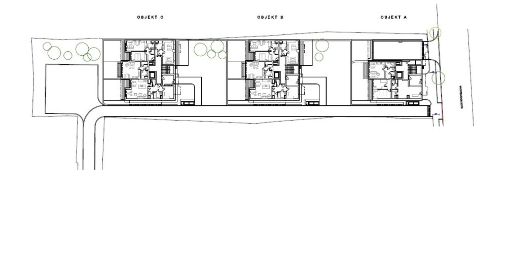 Tři bytové domy jsou umístěny v zahradním prostředí, naproti