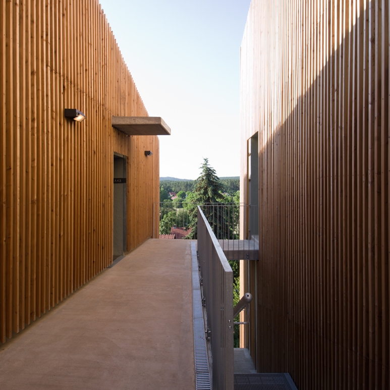 odkazuje k přírodním kvalitám lokality a na fasádách vytváří kombinace