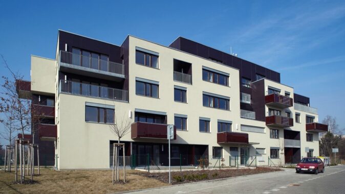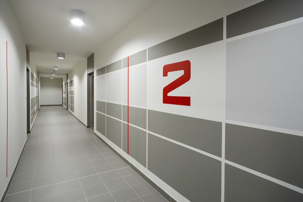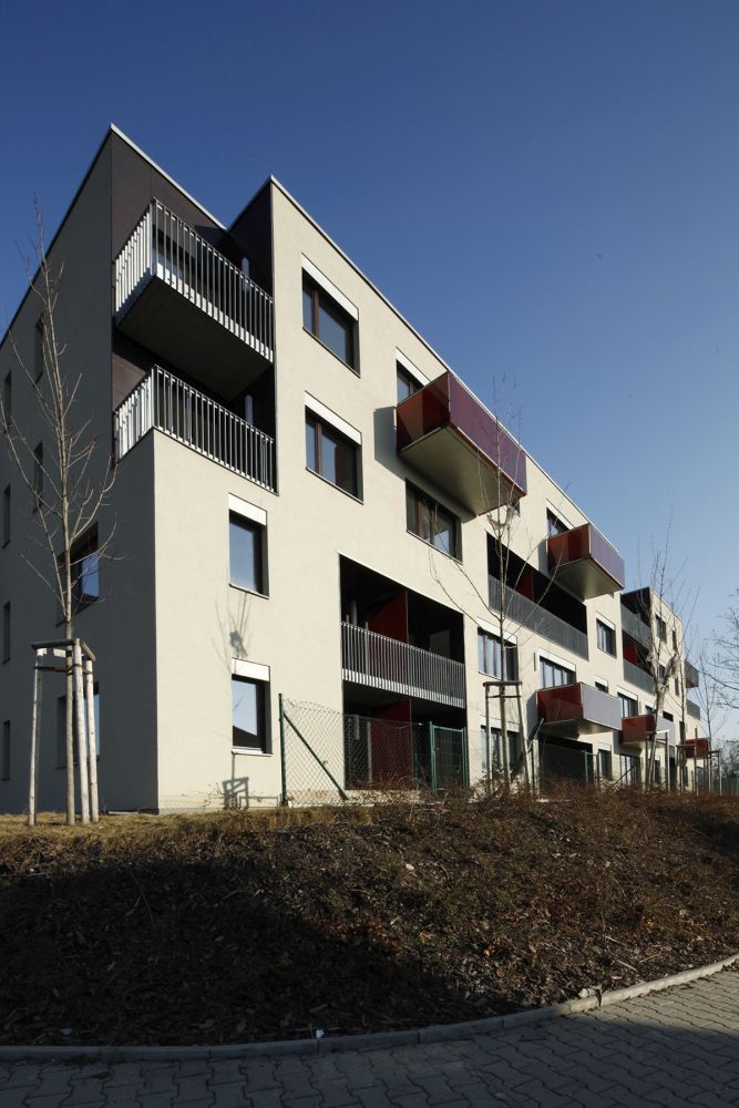 akcentem jsou zábradlí balkonů z červeně tónovaného bezpečnostního skla.