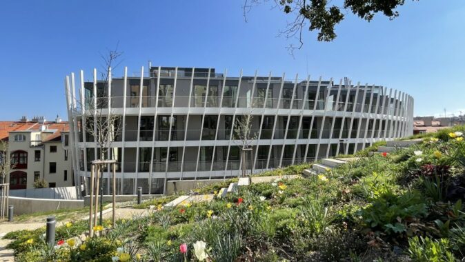 Proluka po tiskárně je vyplněna jen do části výšky navazující blokové zástavby. Podnožím domu je prosklený sokl, nabízející kancelářské a obchodní plochy. Na něm stojí jako solitér pětipatrová rezidenční budova, odsazená od uliční čáry a chráněná protihlukovou skleněnou stěnou, která navazuje na fasádu soklu. Dynamiku elipsy umocňují vějířovitě ustupující terasy bytů na východní straně. Podtrhuje ji i systém svislých lamel, které dávají vyniknout průběžně se měnícím sklonům fasád. „Eliptický bytový trakt je obklopen zelení historických zahrad a na jihu lemován vegetací na střeše soklu. Stojí nad uliční frontou a díky jeho transparentnímu plášti vznikají výhledy ze všech bytových pater. Byty na nižších podlažích a všechny na sever orientované pokoje se díky velkorysému prosklení otevírají do zahrad, ohromující jsou dálková panoramata při pohledu z horních pater a střešních teras, zejména jižním a východním směrem,“ zdůraznil Richard Doležal z DAM architekti.