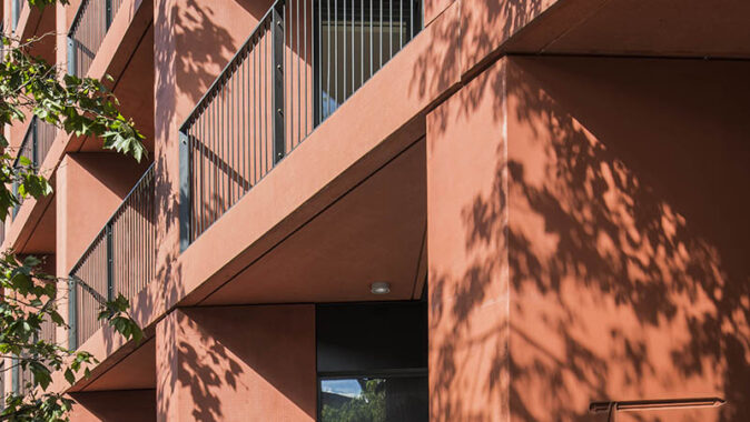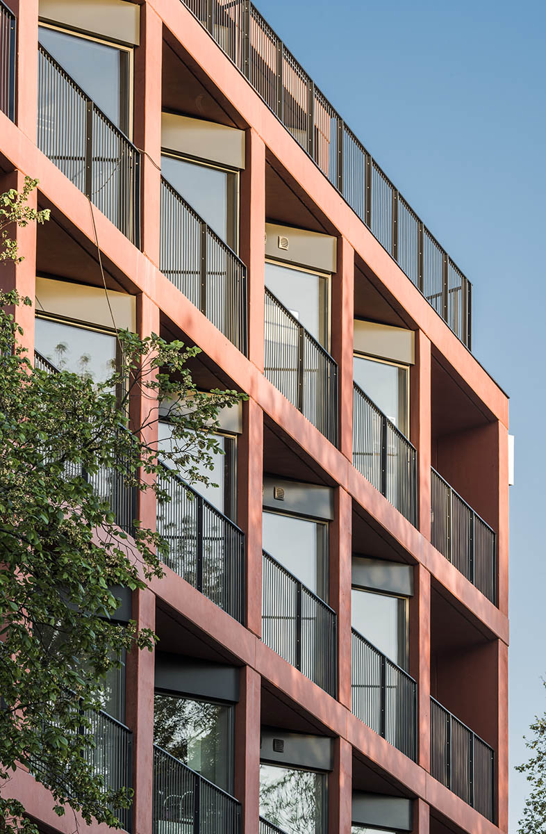 Volnou parcelu nepravidelného tvaru vyplnila hmota sedmipodlažního bytového domu. Na tom samém místě mohla vzniknout běžná stavba s lepší či horší architekturou. Investorem domu ale byla firma vyrábějící betonové prefabrikáty a novostavba se měla stát ukázkou neomezených možností její technologie. Předvýroba stavebních dílců proto dosáhla maximálního stupně a sami autoři ji označují za totální. Prefabrikované jsou všechny vnější i vnitřní konstrukce. Obvodové stěny jsou řešeny sendvičové s různobarevným betonem na obou stranách a s izolací uprostřed. Okenní modul je složen z více částí, ale pokaždé se jedná o dílce, které se po transportu na stavbě pouze montovaly. Červená barva betonových elementů je přirozenou reakcí na barvu okolních cihelných staveb. Barvu charakteristickou pro tuto tradičně průmyslovou část města. Na první pohled nepotřebná kreace trojúhelníkových lodžií představuje velmi racionální vyrovnání se šikmou parcelou a současně vtipné technické řešení přechodu stropní konstrukce mezi vytápěným interiérem a venkovním prostředím.