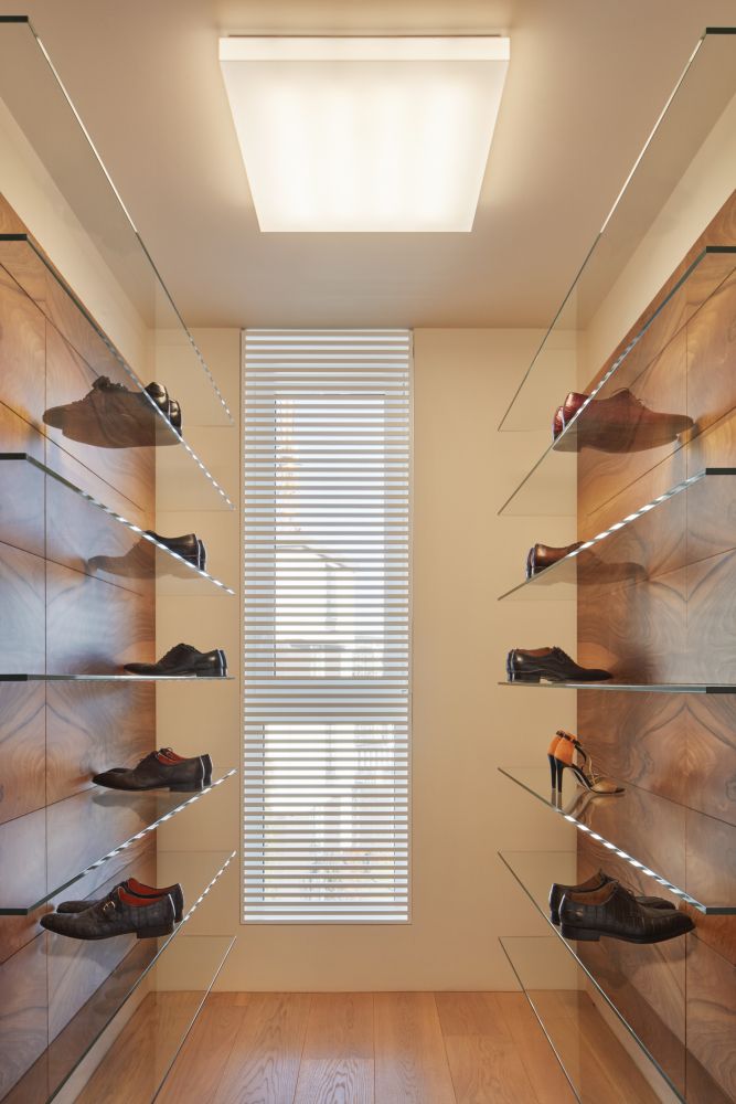 podstavy je pokrytá obkladom z materiálu Hi-Macs a ukrýva v sebe walk-in botník