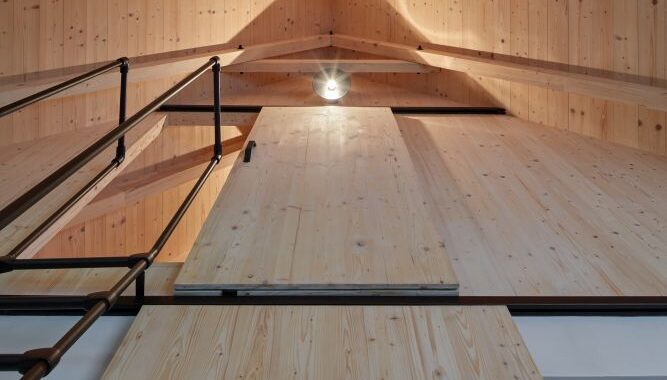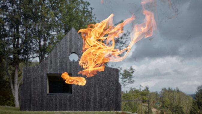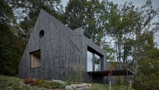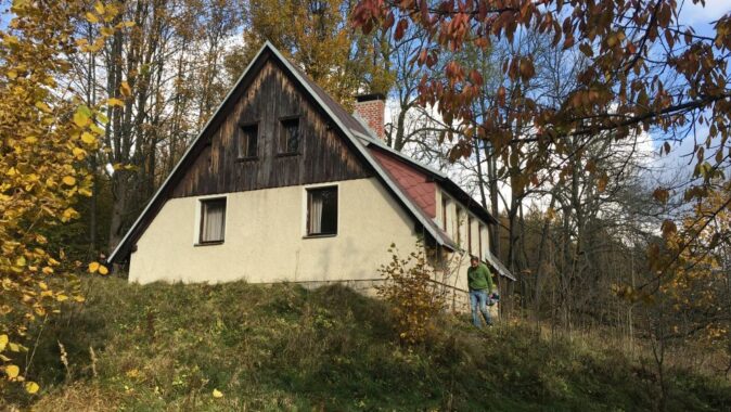 Nad údolím Horské Kamenice šumí opadaný buky, se kterými si vítr pohrává jako s nějakým pravěkým hudebním nástrojem. Z černýho domu na úpatí kopce stoupá bílej kouř, kterej dává tušit, že chata není prázdná. Původní tvář nedostavěné chaty z osmdesátých let se změnila k nepoznání. Šedivý brizolit nahradilo černé dřevěné obložení, které si majitelé sami opalovali. Obklad přechází i na střešní plochy a hlavní dům i s malou chatičkou tak vypadá hodně abstraktně. Termíny jako střecha, zeď, či komín splývají v jediném celku. Stojí tu dům s okny a terasou. Některá z oken ořezává fasádní obložení do kulatého tvaru. Dům vypadá jako přerostlá ptačí budka.