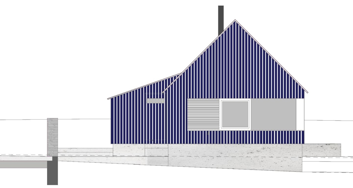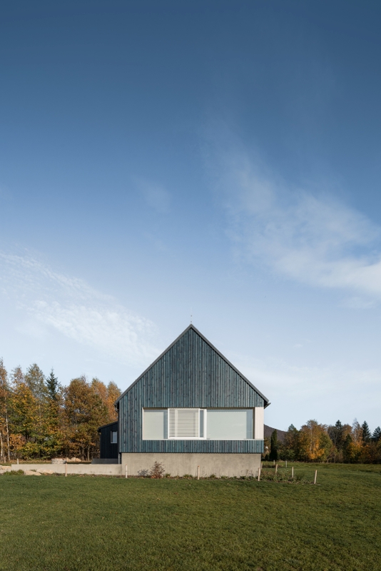 Fasáda je řešena prkenným obkladem tmavomodré barvy. Vše, co je součástí oken, je v barvě bílé: dřevěné okenní rámy, dřevěný parapet, dřevěné žaluzie a okenice, a dále obklad pevného rohu okna. Výjimku představuje okno střešní, jehož členění navazuje na konstrukční systém střechy a okenní rámy jsou tedy v barvě střechy. Střešní krytina je navržena z tmavošedých asfaltových pásů. Dům je i s parkovací plochou do terénu usazen tak, aby byly potřeba pokud možno minimální terénní úpravy. Opěrná zeď vyrovnávající terén na severu domu je vyzděná z místního kamene pískové barvy. Sokl domu je z pohledového světlého betonu. Ze stejného materiálu jsou i nízké opěrné zídky přecházející do obrub parkovací plochy. Stání pro čtyři automobily je provedeno ze žulového perku.
