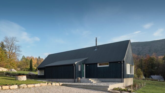 Objekt je řešen jako dřevostavba; dřevo se uplatňuje plošně v celém interiéru pohledovou biodeskou na stěnách stropě a střeše. Dřevěné jsou i vnitřní dělící stěny. Podlaha je navržena z šedé cementové stěrky. Venkovní dřevěná terasa je provedena z modřínových prken. Kamenné patio je vyskládáno z místního štípaného kamene.