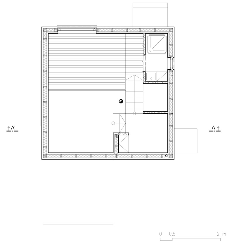 Zvenku kostka, uvnitř ní se odehrává bohatý život. Prostor je členěn na úrovně – oddělující vstup, pobytovou část i spaní. Chatka a její obyvatelé vnesli do místa opět život, sad začíná rodit své plody, stará studna zásobuje vodou zahradu, na místě usedlosti je venkovní kuchyně.
