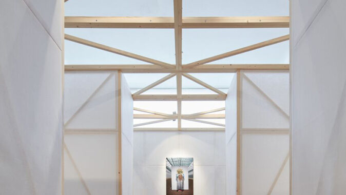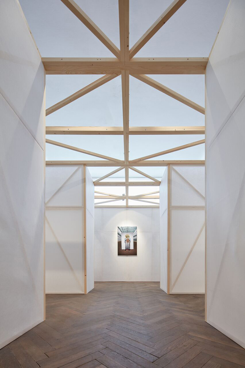 Dřevěná konstrukce panelů se rytmicky opakuje a dává výstavnímu sálu měřítko.