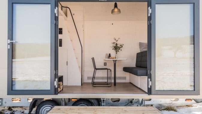 Interiér Mobile Hut je propojen od podlahy po hřeben střechy. Na první pohled se může domek zdát malý, ve skutečnosti je prostorný a nahradí i byt o dispozici 2+kk. Najdete zde plnohodnotnou kuchyň, jídelnu i koupelnu. Pod střechou se nachází hlavní spací část pro dvě osoby, ale v domku se pohodlně vyspí až 4 dospělí. Čalouněné sezení v dolní části Mobile Hut slouží jako rafinovaný úložný prostor, místo k dennímu odpočinku a v noci po rozložení, jako další dvě spací místa.