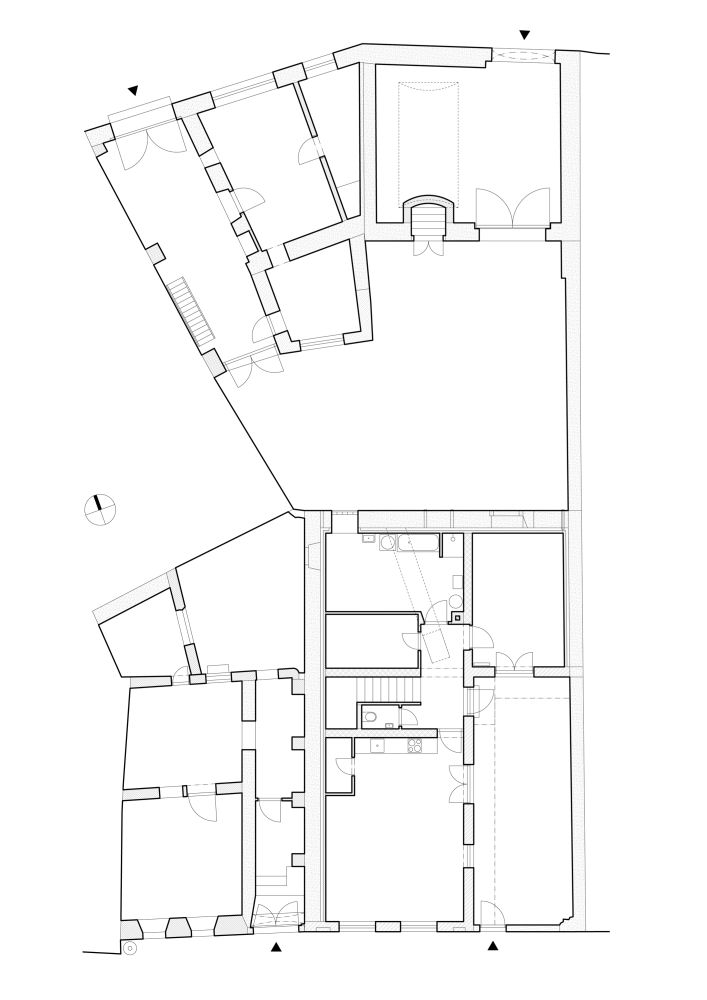 Objekt pro bydlení vznikl propojením dvou sousedních domů. Jeden z nich prošel na přelomu tisíciletí výraznou stavební úpravou, druhý se nacházel v havarijním stavu. Souhmotí jsme zbavili nevhodných novodobých prvků, například velkého vikýře s balkonem a plastových oken. Za přizdívkami jsme pak objevili kamenné zdivo a drobné, pro nás cenné historické fragmenty.
