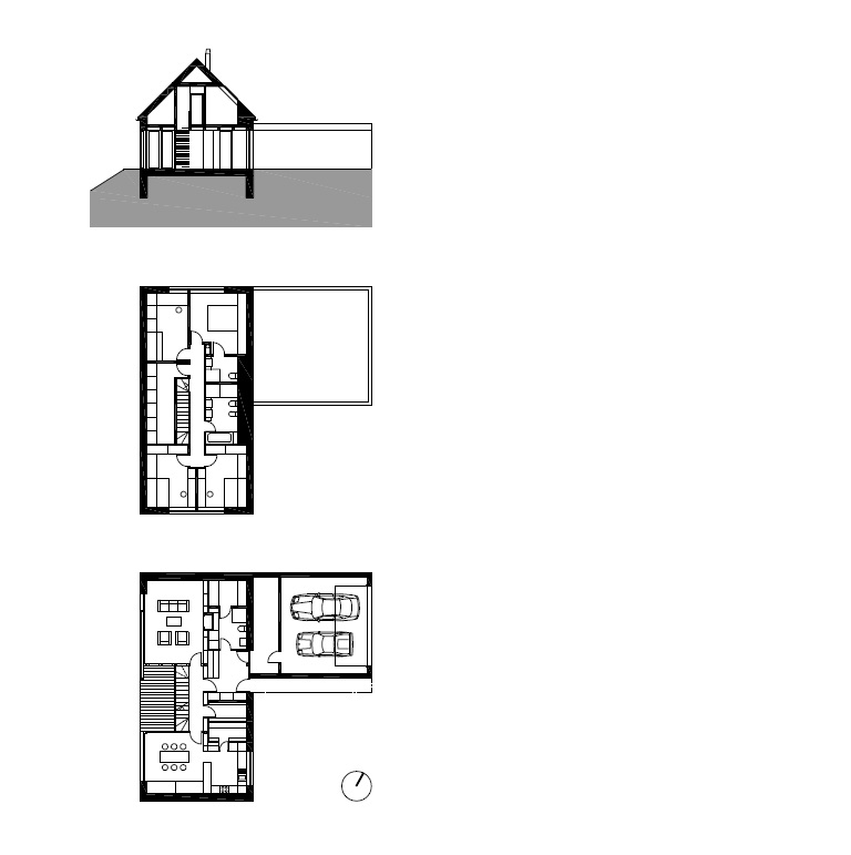 hřebenem rovnoběžným se silnicí, propojená s přízemní dvougaráží, jejíž plochá