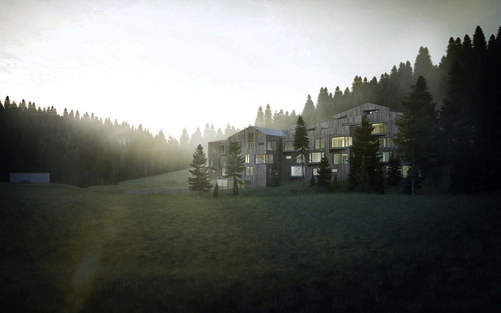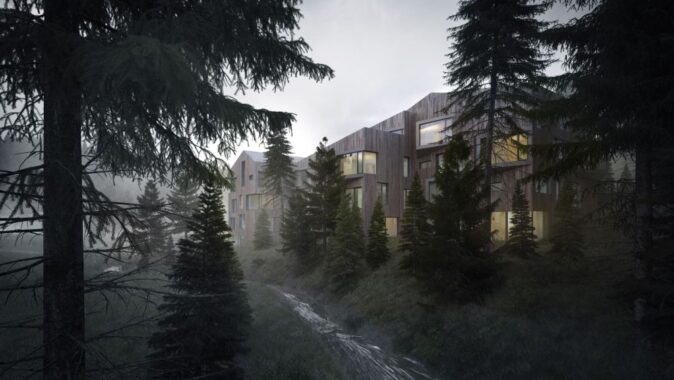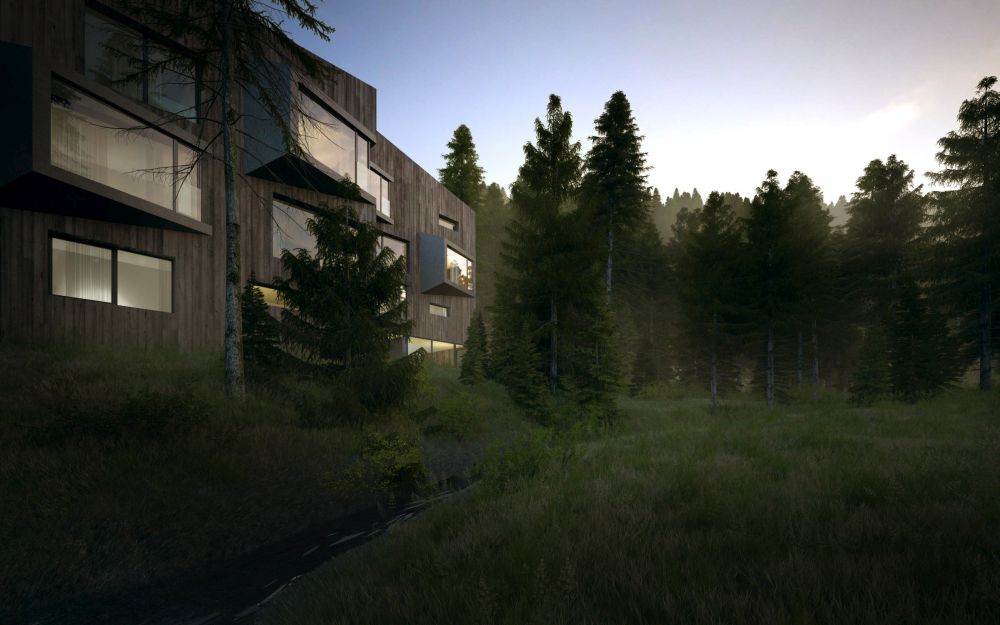 hmota objektu kopíruje svažitý terén a prolíná se s okolním lesem.