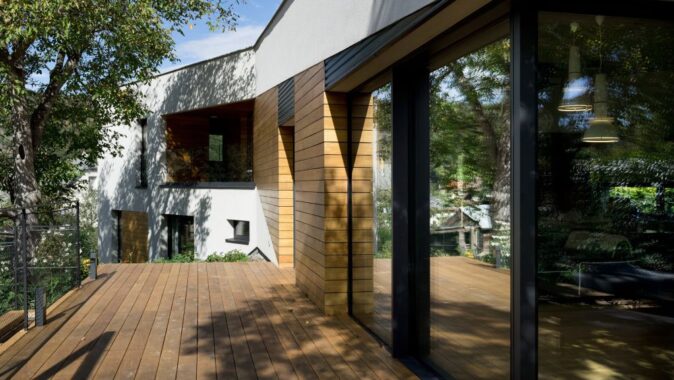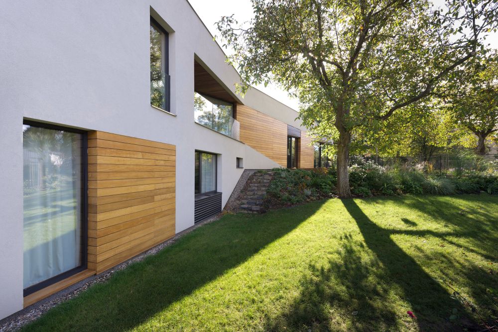 Konstrukčně je dům monolitický železobetonový skelet s vyzdívkami z dutinových cihel. Fasádu tvoří kontaktní zateplovací systém s provětrávanou fasádou z tropického dřeva garapa s olejovým nátěrem. Okna jsou hliníková s trojsklem od firmy Schüco. Stejné značky jsou i vchodové dveře s čtečkou prstů. Dům využívá tepelné čerpadlo a sluneční energii.