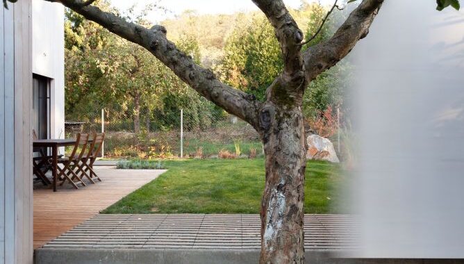Posuvná vrata nechávají proudit zahradu kolem domu. V případě potřeby je však možné je uzavřít a vytvořit tak z dvora intimnější zákoutí. Skrze velké prosklené stěny zůstávají obě části domu pocitově propojené. Dvůr se tak stává přirozenou součástí interiéru.