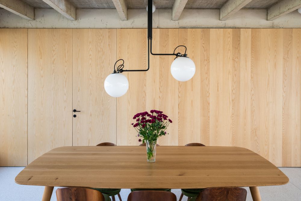 Prostor přízemí se do vnitřních zahrad otevírá ze dvou stran. Hlavní obytnou část v centrální části jsme vybavili servisním boxem schodiště, skladových prostor a hygienického zázemí. V přízemí se nachází také pracovna a ložnice rodičů s koupelnou. Kuchyň je orientovaná do zahrady s bylinkami, obývací pokoj k pobytové zahradě s bazénem. Díky velkému světlíku nad kuchyní proniká do centra dispozice difuzní světlo. V druhém nadzemním podlaží jsou dětské pokoje.