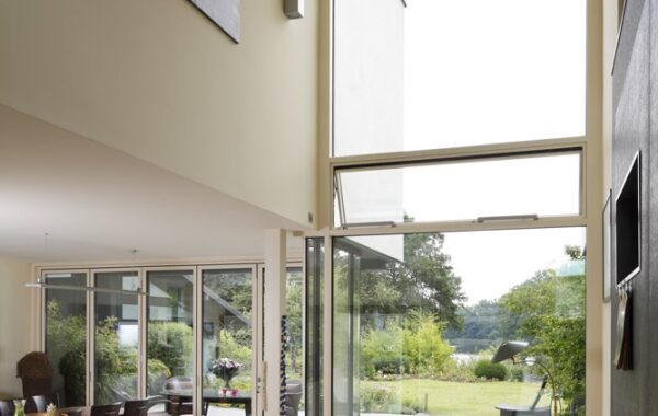 výhledem na jezero byly instalovány skládací dveře z profilů Schüco ASS