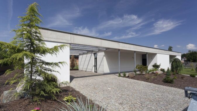 nachází volný obytný prostor s kuchyní a zimní zahradou. Jednotlivé objemy jsou