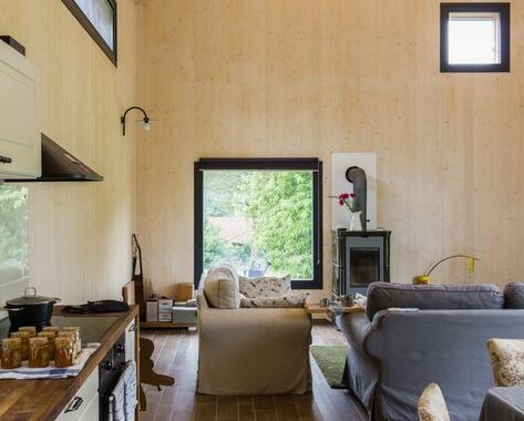 Přízemí je propojené se zahradou, v patře s menší podchodnou výškou vznikly prostory pro spaní. Vertikální propojení dává relativně malým pokojům novou kvalitu a pocit vzdušnosti.