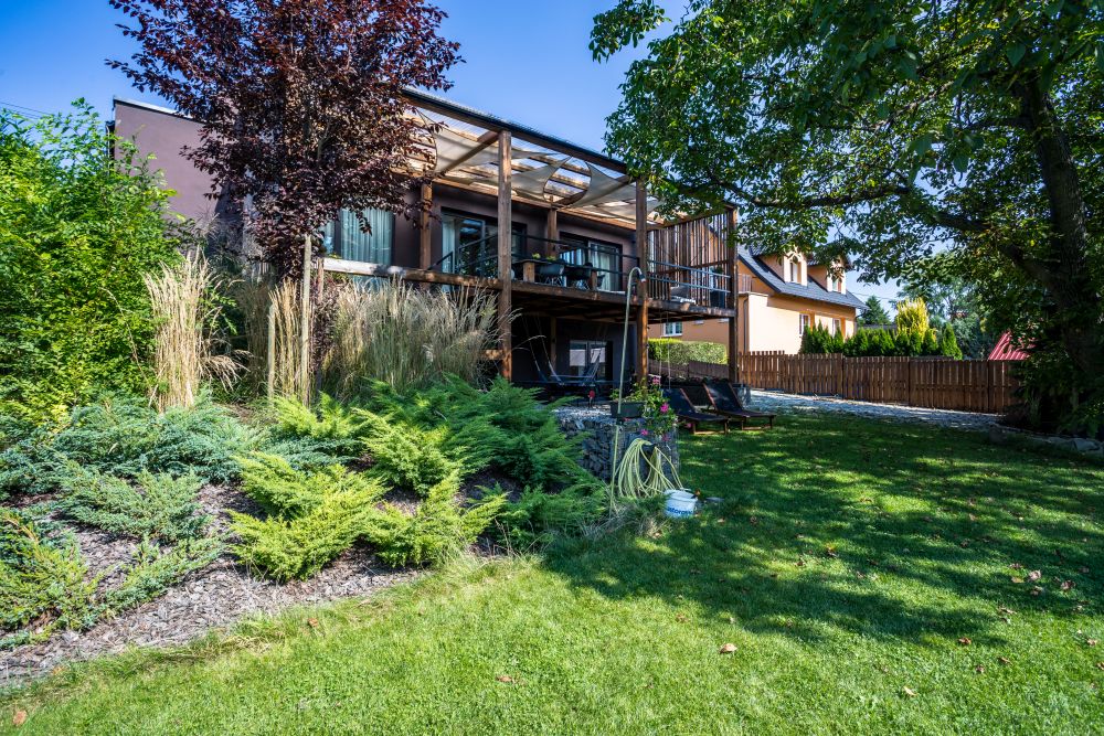 Z exteriéru byl dům řešen v jednoduché a čisté formě s rovnoměrně rozloženými okny. Okna do ulice jsou zvětšena, na bočních fasádách jsme navrhli nová francouzská okna. Z jihu byla fasáda maximálně prosklena a otevřena do zahrady. Dominantou je terasa tvořená prostorovým rámem z opalovaných a kartáčovaných jedlových trámů. Pro sjednocení a změkčení ploch fasády byl kolem oken a na bocích terasy instalován svislý obklad z modřínových hranolů. Na terase plní funkci slunolamu a zároveň blokuje pohled ze sousedních zahrad. Celá fasáda je barevně řešena v temně hnědé čokoládové barvě.