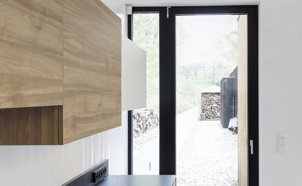 V interiéru jsme na obvodových konstrukcích použili prkna, natřená na bílo, vnitřní příčky jsou sádrokartonové, podlaha litá cementová stěrka, v koupelnách jsou na stěnách stěrky, v jedné z nich černobílé obklady. Nábytek jsme navrhli jako vestavný na míru: jde kombinaci bílých lakovaných MDF a olejovaného dubu. Drobné, kontrastní detaily jsou černé.