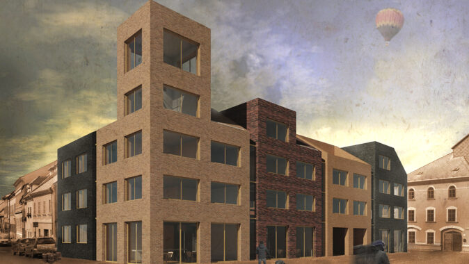 V návrhu bytového domu pro Žatec jsem se pokusil vhodně zasáhnout do kontextu Pražského předměstí, bývalé průmyslové čtvrti. Mělkou dispozici návrhu definovalo rozhodnutí plně využít vnitroblok. Budova reaguje na měřítko okolních domů a je rozdělena na osm menších hmot, v každé se nachází jeden vertikální mezonetový byt. K jejich lepšímu odlišení a navození pocitu vlastního domova mají různě barevné cihlové fasády.