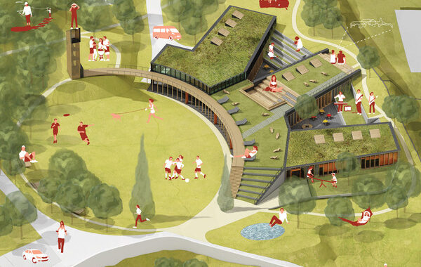 Centrum bude v místě, kde dřív stávala Fischerova cihelna. Radnice vyhlásila na jeho podobu architektonickou soutěž, přihlásilo se pět účastníků a vyhrál ateliér Vizage s architekty Ivanem Palackým, Romanem Čerbákem, Tomášem Doležalem, Petrem Čáslavou a Martinem Klenovským. „Základní myšlenkou vítězného návrhu je rozdělení jednotlivých provozů do tří objektů, které jsou propojené společným foyer,“ uvedl Bořecký. Ve foyer bude i prostor pro knihovnu, šatny a zázemí, ale taky pro kavárnu, která bude mít venkovní atrium mezi společenským sálem a školkou, odkud bude vidět i na Špilberk. „Součástí areálu bude věž, ze které bude možné dohlédnout až na Petrov nebo na zvonici augustiniánského kláštera,“ doplnil architekt Palacký.