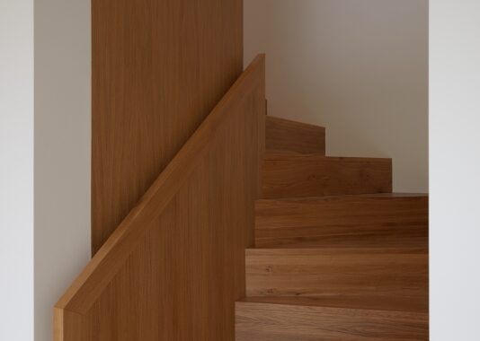 Nevšední designový prvek zde představuje otočná stěna. Svým vzhledem připomíná velké dveře bez kliky, které, když je otevřete, zcela kopírují sousedící stěnu. Můžete tak získat otevřený přístup do šatny i kuchyně, přičemž dřevěná stěna zůstává součástí prostoru – ať už otevřená nebo zavřená. Ložnice s vlastními koupelnami se nachází v horním patře a jsou orientovány do průčelí nebo do zahrady, tudíž jsou odkloněny od případného hluku silnice. Svou plochou jsou velmi velkorysé a jejich vyšší otevřené stropy sahající až do hřebene střechy navíc zajišťují výborné klima a dostatek vzduchu v místnostech. Ve větší ložnici je velký úložný prostor, který nahrazuje absenci sklepa nebo komory.
