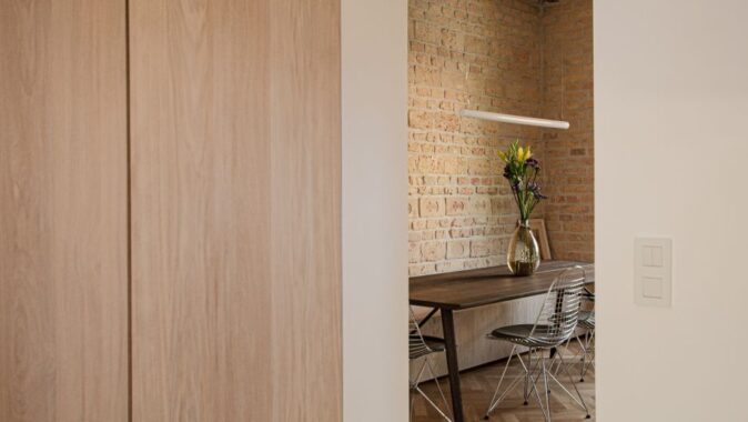 Nalevo od hlavního vstupu se nachází malá technická místnost, na kterou navazuje oddělené WC. Právě to je v záměrně propojeném prostředí přízemí jedinou výjimkou, která kvůli zachování soukromí disponuje interiérovými dveřmi. I ty však zachovávají nastavený ráz interiéru. Povrch dveří je vyveden ve stejné dubové dýze, jako okolní plochy, a díky variantě se skrytou zárubní není průchod zatížen zbytečnými rušivými liniemi. Nenápadnost ve spojení s funkčností a kvalitou byla uplatněna také při výběru dveřního kování. Dveře jsou vybavené klikou MINIMAL z dílny české rodinné manufaktury M&T, pro níž byla zvolena z osmnácti dostupných povrchových úprav barevně ladící varianta broušeného niklu. „Kování jsme vybírali na základě vzhledu a kliky MINIMAL jsme zvolili pro jejich čistý, minimalistický design,“ říká Marián Gombarček. Požadavkům minimalistického interiéru kliky MINIMAL vyhovují zejména díky skryté rozetě nepřesahující jejich obrys.