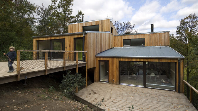 smrkové stěny a modřínová fasáda, ze silných a širokých prken, voní.