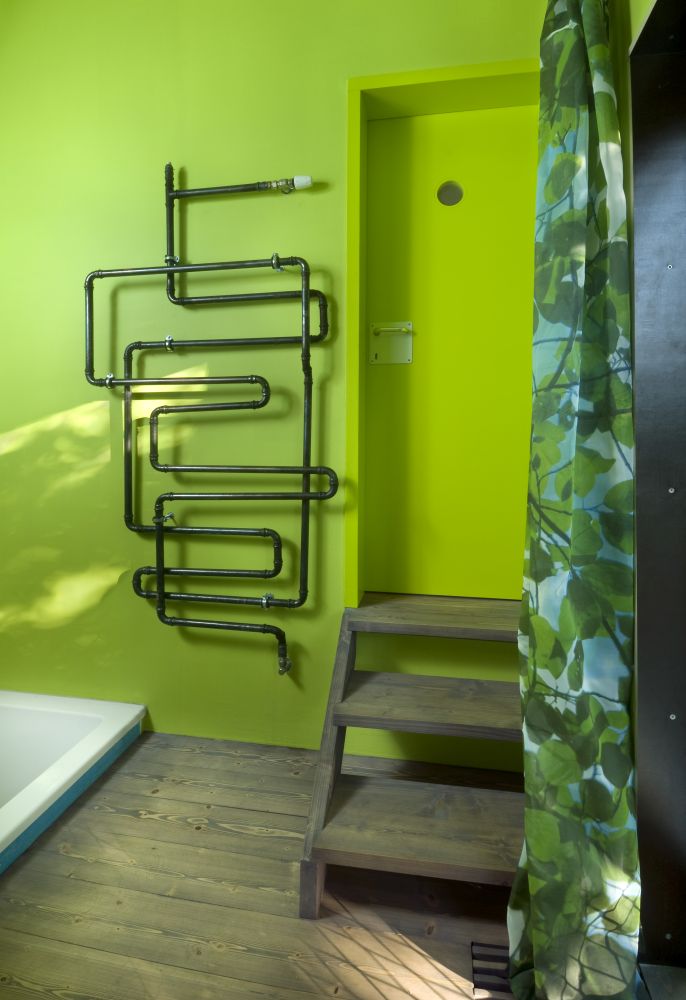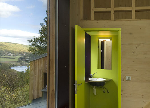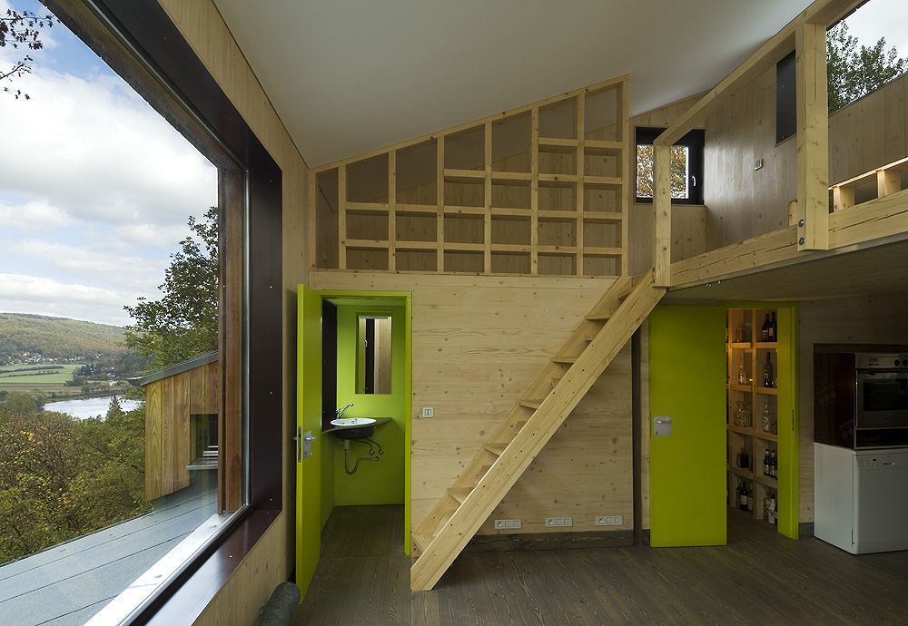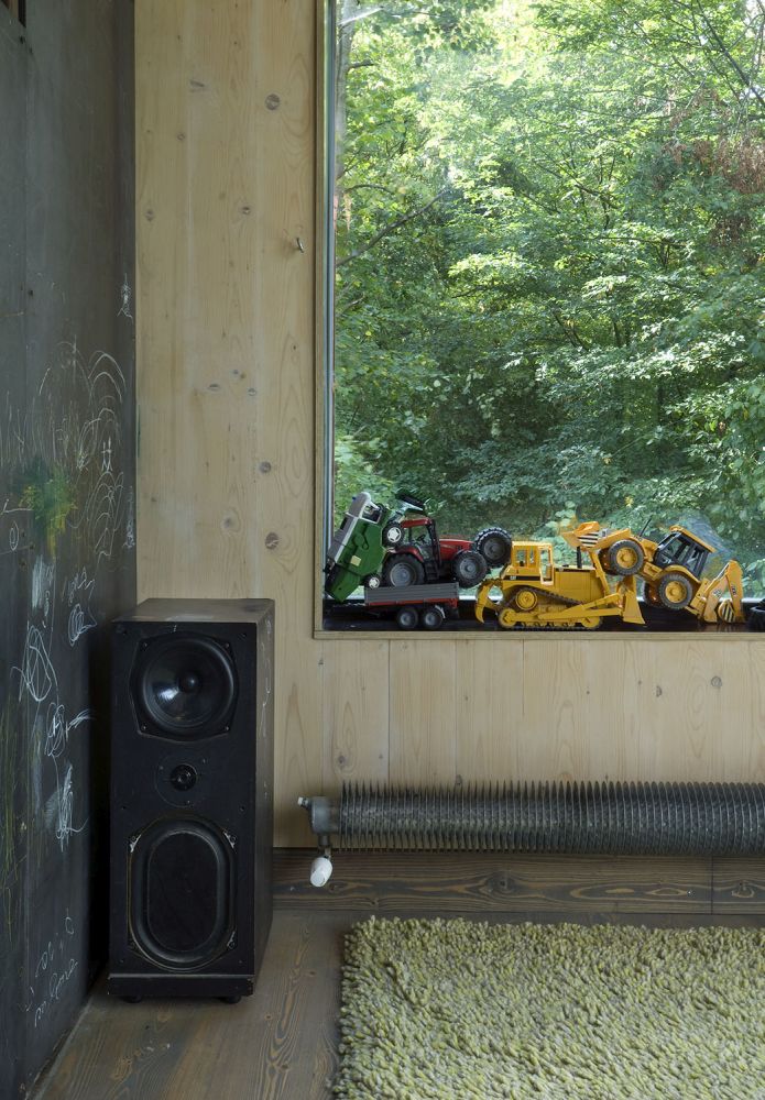domů, která uvnitř, leckde neopláštěna, slouží jako police. Jedlové podlahy,