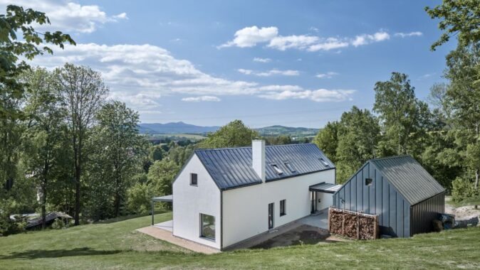 Dům se nachází na okraji obce na parcele, která se svažuje k jihozápadu. Její velkou devizou je výhled na Ještěd přes údolí a celou obec. Z toho také vychází koncept domu, jehož fasáda je „natažena“ podél těchto výhledů a okna ji prořezávají v jednotlivých pokojích tam, kde to dispozice vyžaduje.  Exponovaná fasáda tak nabízí zdánlivě nahodilou variaci různých velikostí a tvarů otvorů, které jsou však jen poctivým otiskem života v domě.