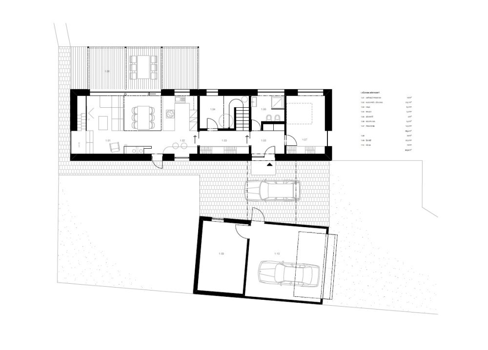 Stavba sestává ze dvou objektů archetypálního tvaru: bílého rodinného domu a černé garáže, spojených plochou střechou parkovacího stání. Uspořádání objektů se podřizuje mladé rozrůstající se rodině s mnoha koníčky a aktivitami, tudíž zvýšenou potřebou skladovacích prostor. Klíčové bylo zkrácení manipulačních cest na co nejmenší možnou míru a jejich omezení na jedno podlaží.