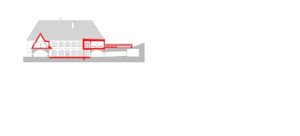 Do přízemí fary byly ještě před naším autorským vstupem situovány obslužné prostory školy a do přízemí dvou hospodářských křídel denní stacionář. Návrh na to reagoval umístěním hlavního provozu školy do patra, čímž mimo jiné vznikla příležitost zachránit hodnotný barokní krov a využít zasazení souboru do paty svahu kostelního návrší. Díky tomu získaly nové učebny prostornou terasu a travnatou plochu, odkud je možné užít si výuku s výhledem na kostel sv. Petra a Pavla.